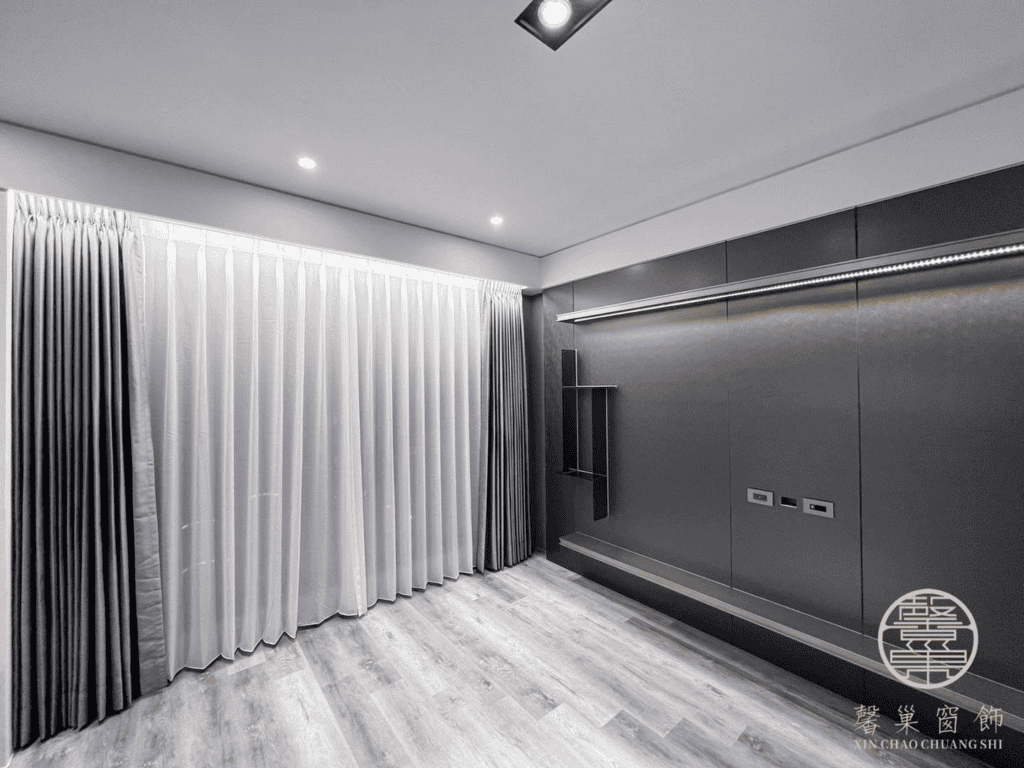 由於電視牆與沙發都是灰色系,所以馨巢窗飾建議業主可以選用一個顏色深一些的灰色全遮光九尺布來搭配,整個窗簾上的設計不僅更有層次感,也更實用了!